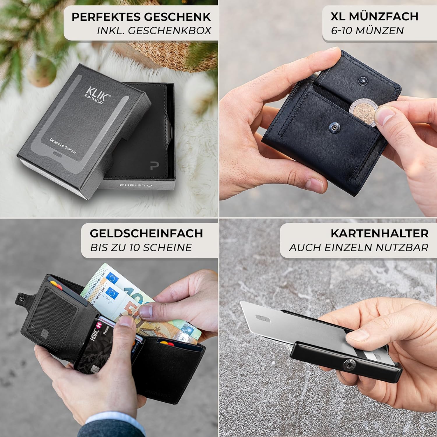 Das Puristo KLIK wird in einer edlen, schwarzen Kartonschachtel geliefert und besteht aus hochwertigen, nachhaltigen Materialien. Es ist klimaneutral zertifiziert und wurde in Europa designt und handgemacht.