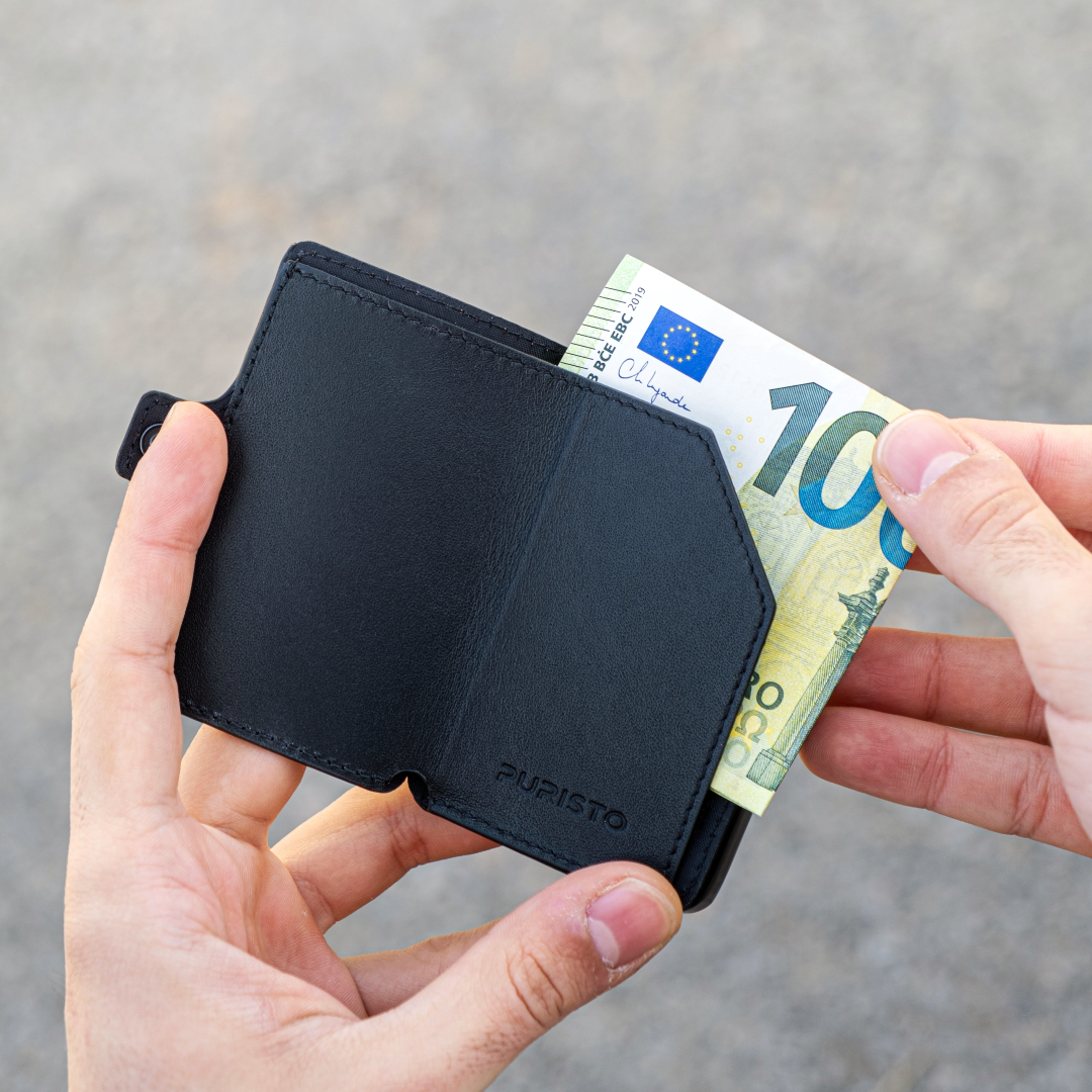 Kaum grösser als der Inhalt selbst – der Puristo KLIK im eleganten Alugehäuse bietet Platz für bis zu 12 Karten. Das clevere Design lässt dir genügend Raum, um das Wesentliche sicher zu verstauen, ohne unnötigen Ballast mitzuschleppen. Auf der Frontseite des Etuis kannst du zusätzlich Noten gefaltet unterbringen.